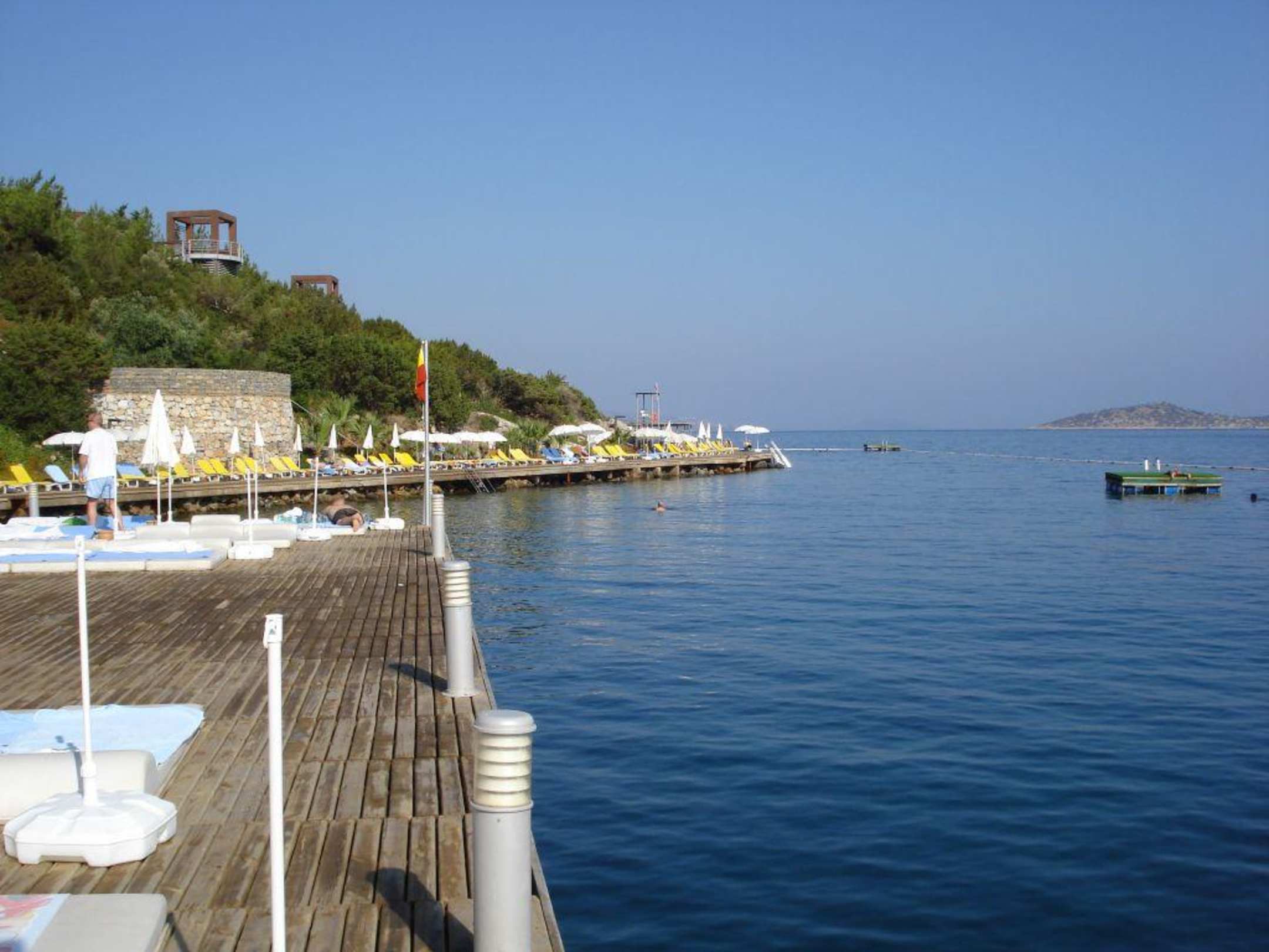 La plageLe long de la coline, une longue plateforme en bois assortie de transats alignés fait office de plage. Eau transparente, magnifique. Accès par l'échelle pour nager (à cause des rochers)