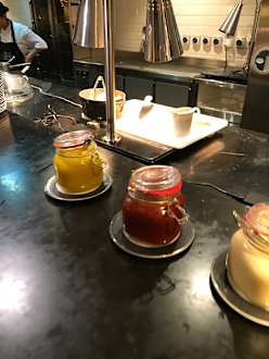 Man beachte die reichhaltige Auswahl an raffinierten Soßen, und die Sauberkeit der Theke