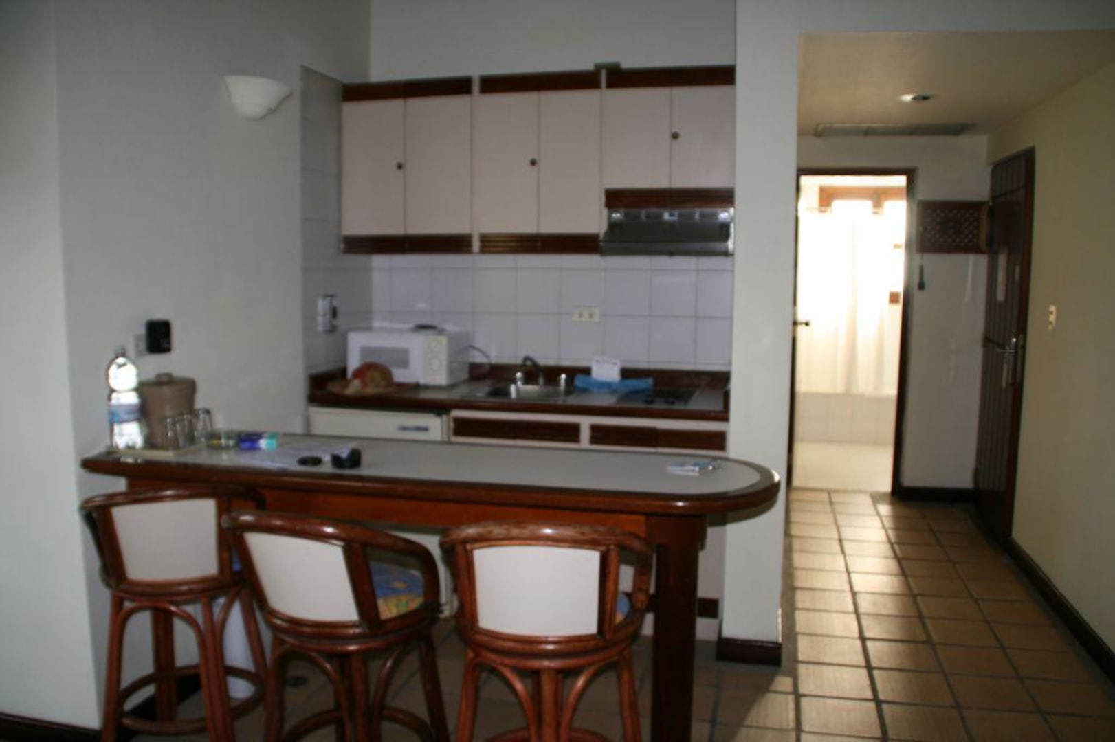Blick auf die Küchenzeile und die Theke.