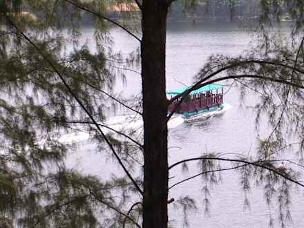 Blick vom Balkon auf die Lagune mit Shuttleboot