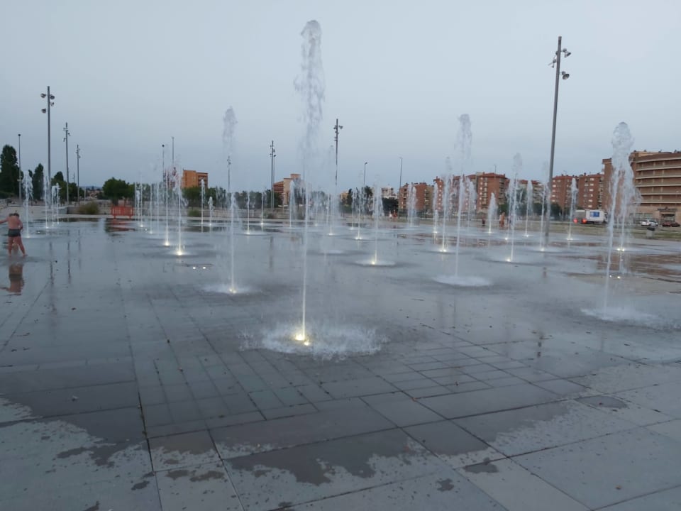 Wasserfontänen auf einem Platz hinter dem Hotel