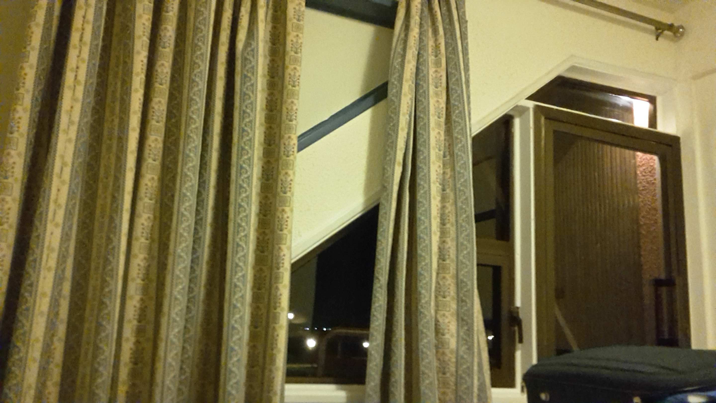 Hinter dicke Vorhängen nur Wand, statt richtige Fenster! (Bild ist mir Blitz gemacht)