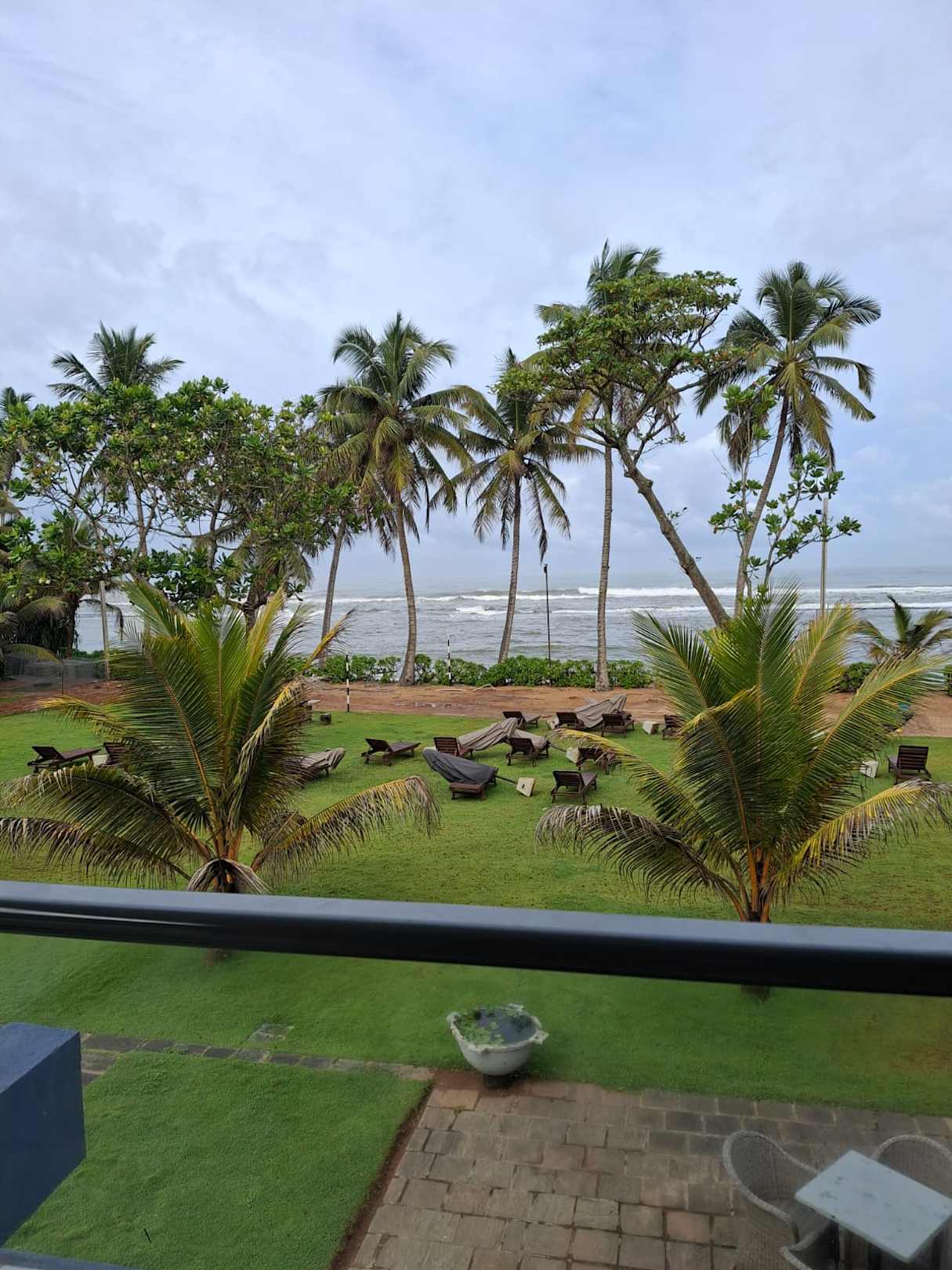 Blick aus dem Zimmer auf den Strand und die Gartenanlage