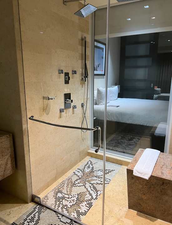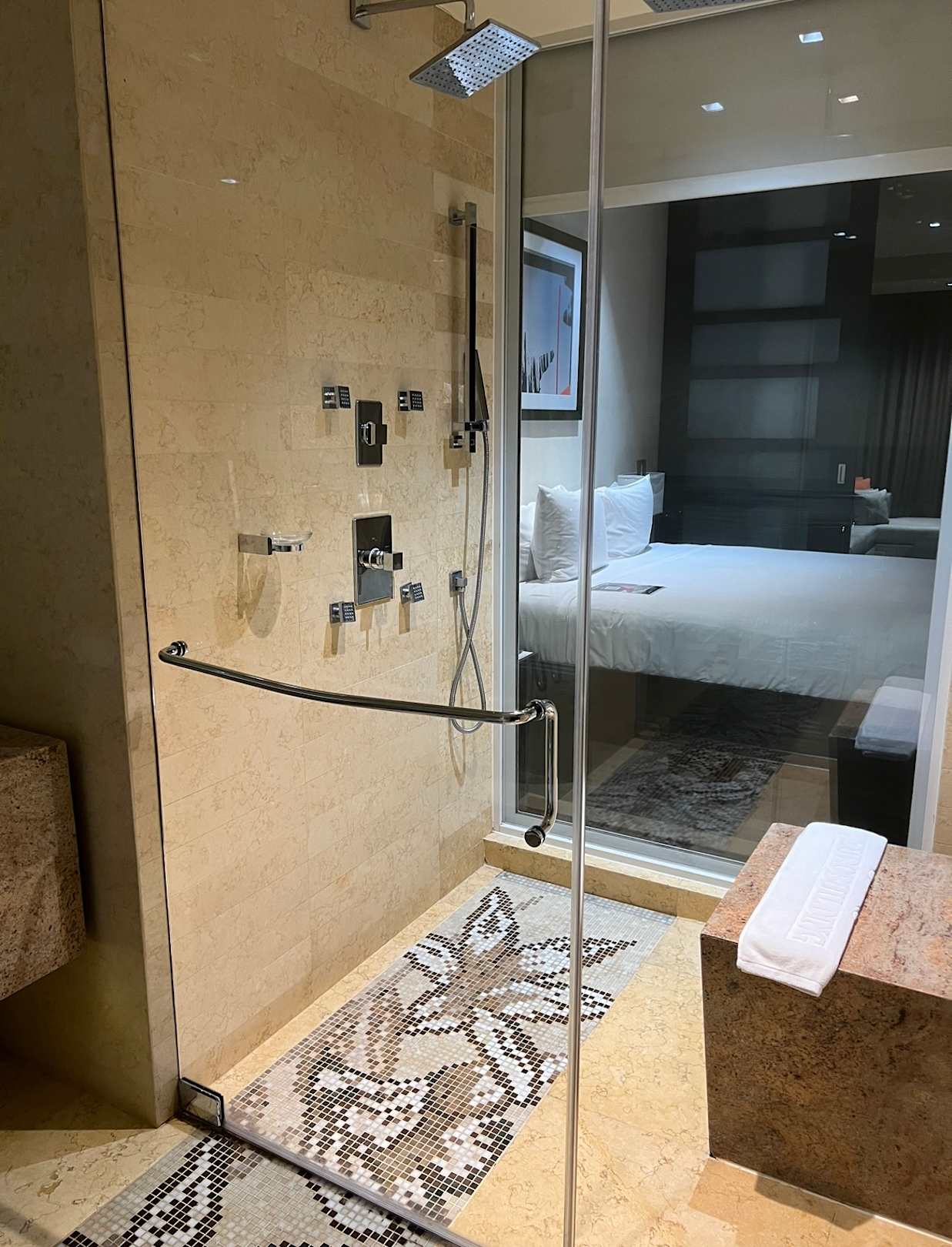 Blick aus dem großen Badbereich Richtung Bett und weiter hinten dann das Fenster.