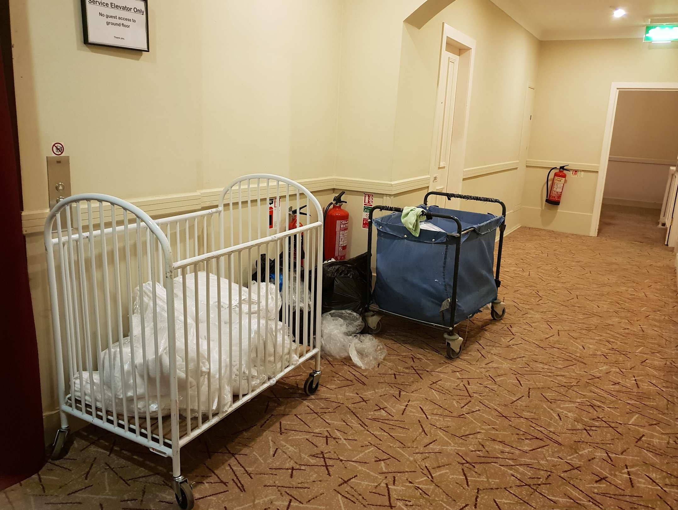 Schmutzige Wäsche wird vor den Zimmern deponiert.