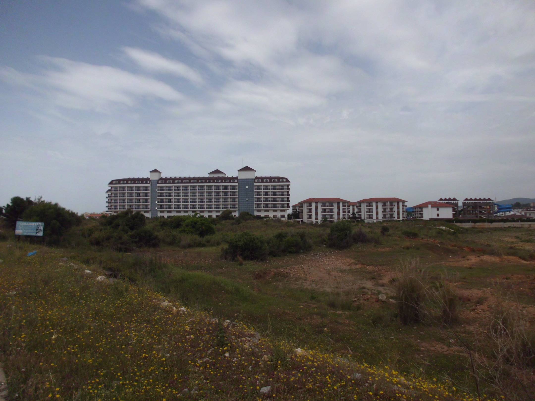 Über die Felder aufs Hotel geblickt