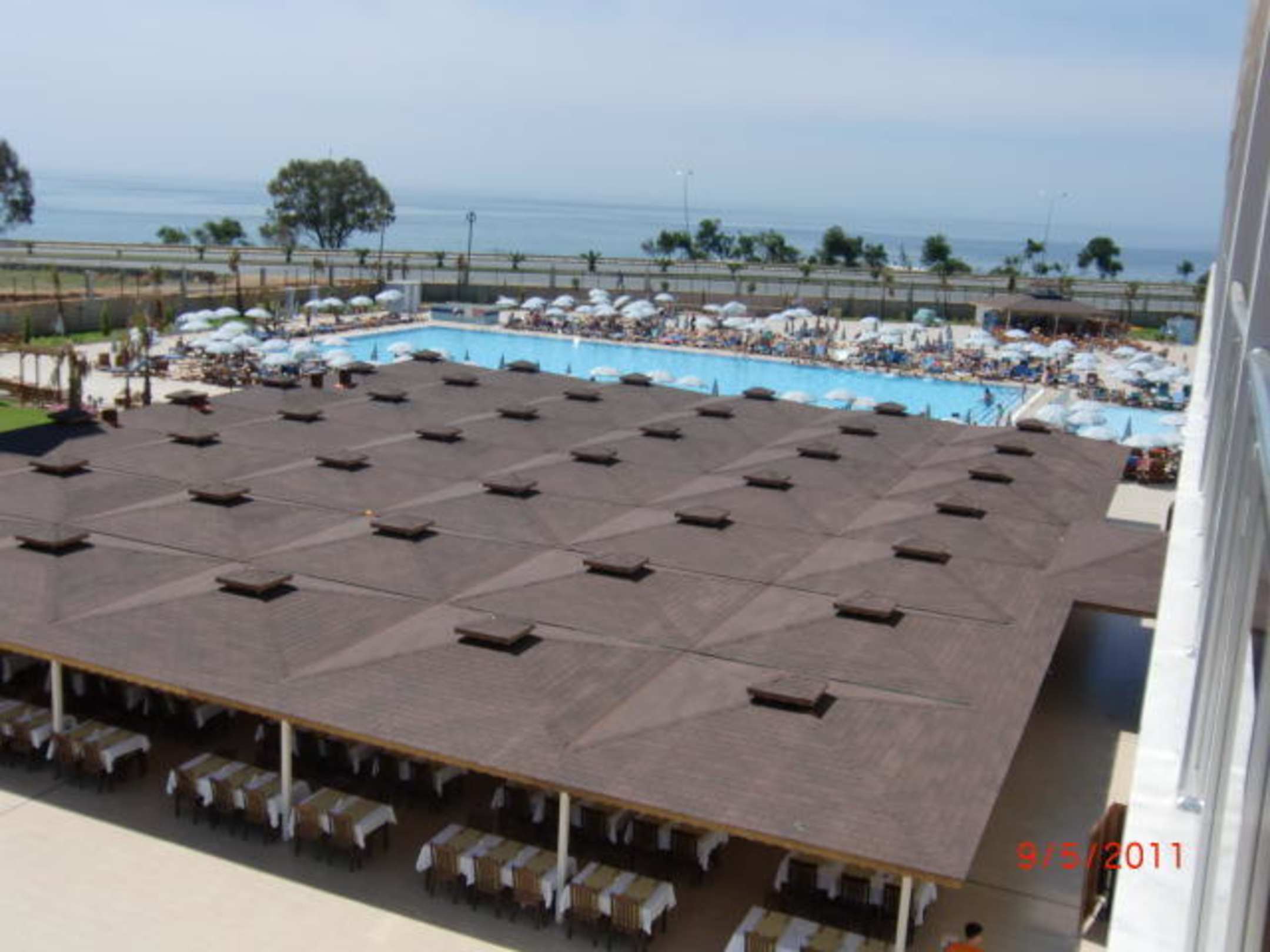 Die Sitzplätze des Main Restaurant und der Hauptpool