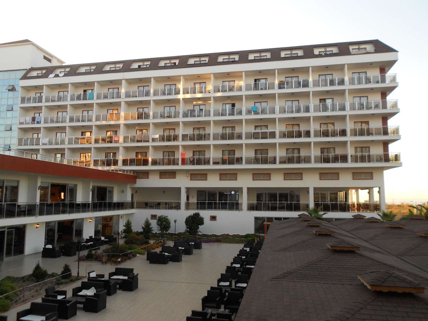 Blick von der Terrasse auf das Hotel