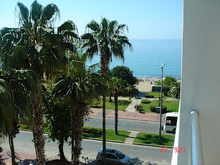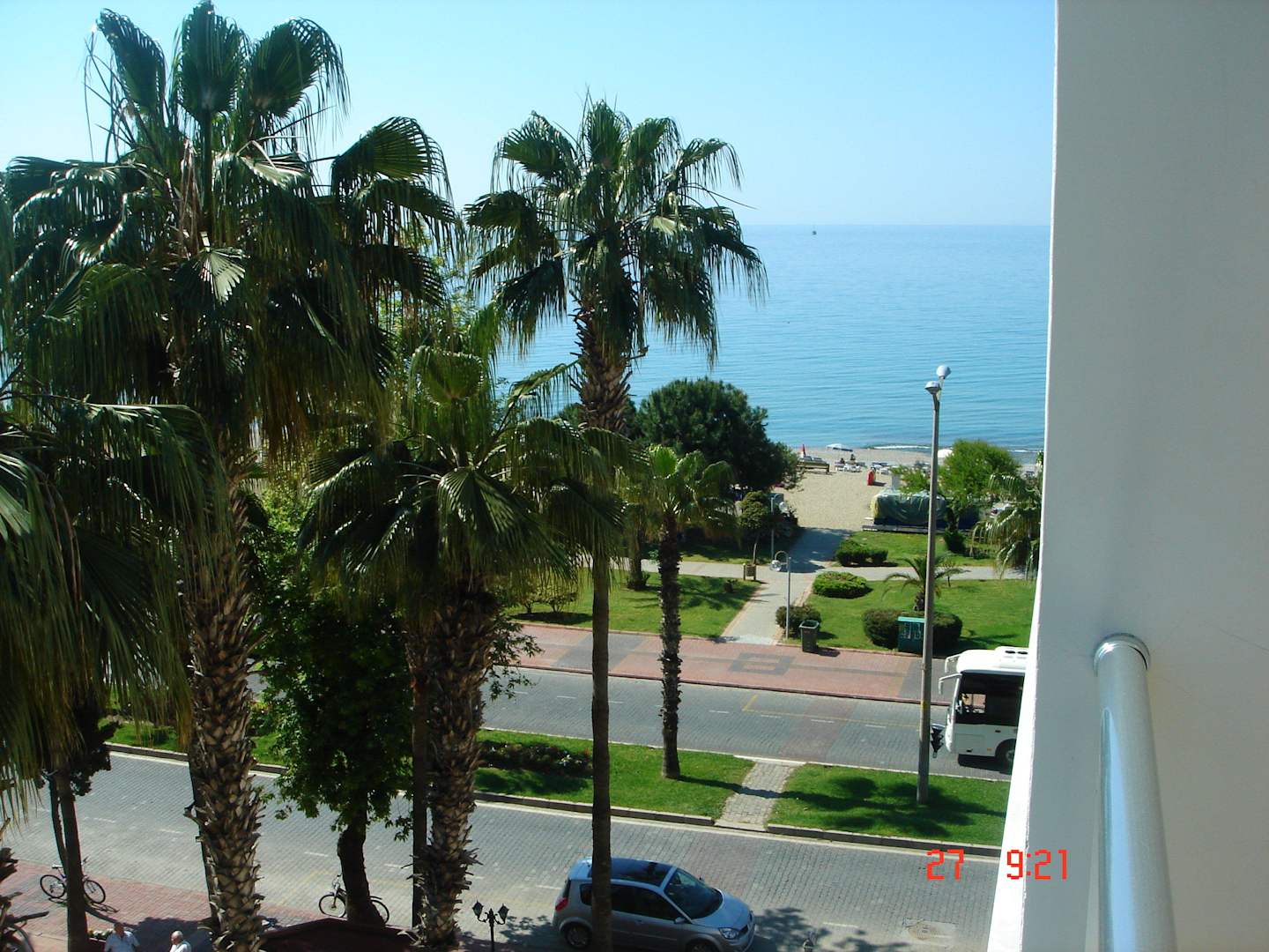 Aussicht vom Balkon auf die stark befahrene Hauptstrasse, die man überqueren muss, um zum Strand zu gelangen. Hohe Lautstärke, d.h. Balkontür kann nachts nicht offen bleiben