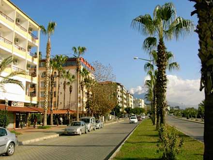 Straße zwischen Hotel und Strandlinks im Bild ein Teil der Hotelanlage. Nach Überquerung der Straße ist man direkt an der Promenade bzw. am Strand