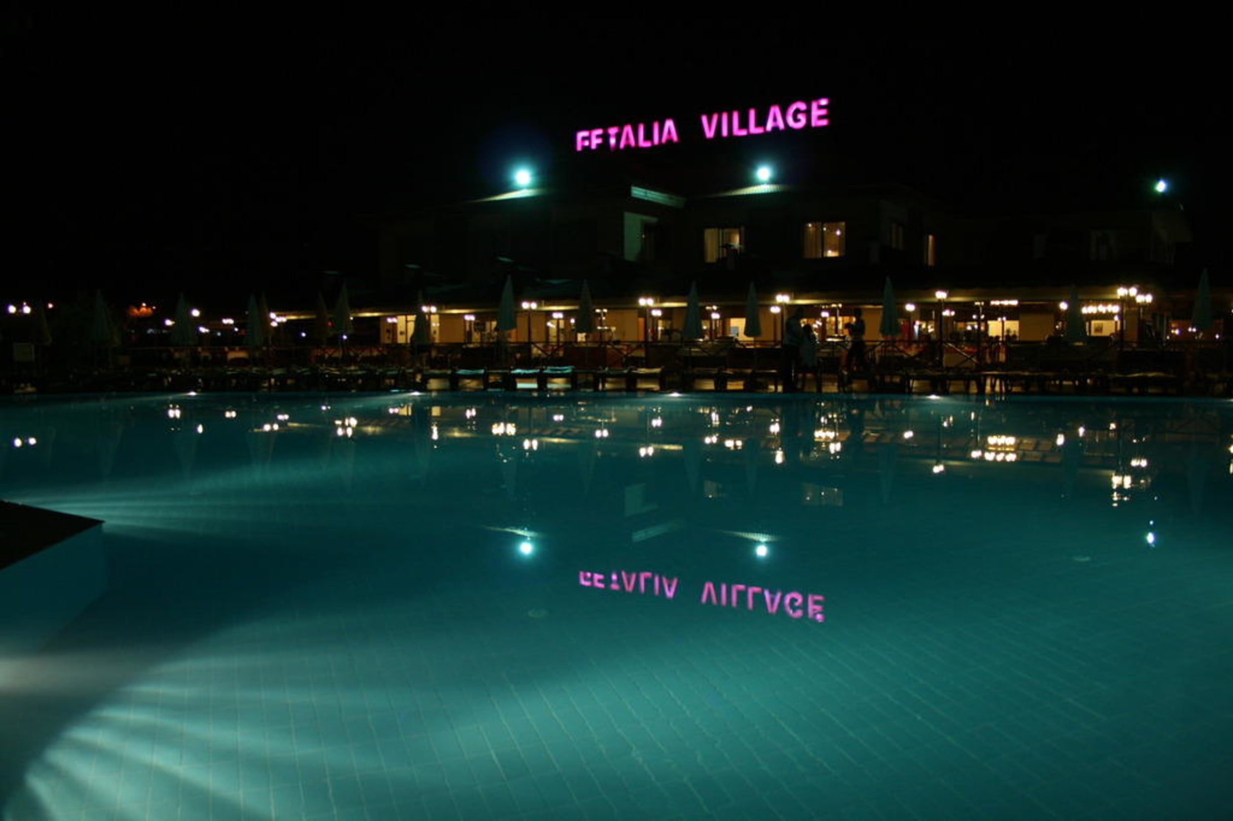 Widok hotelu i basenu noca