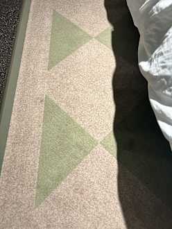 Klebriges Etwas im Teppich vor dem Bett. Wurde innerhalb von drei Tagen nicht entfernt.