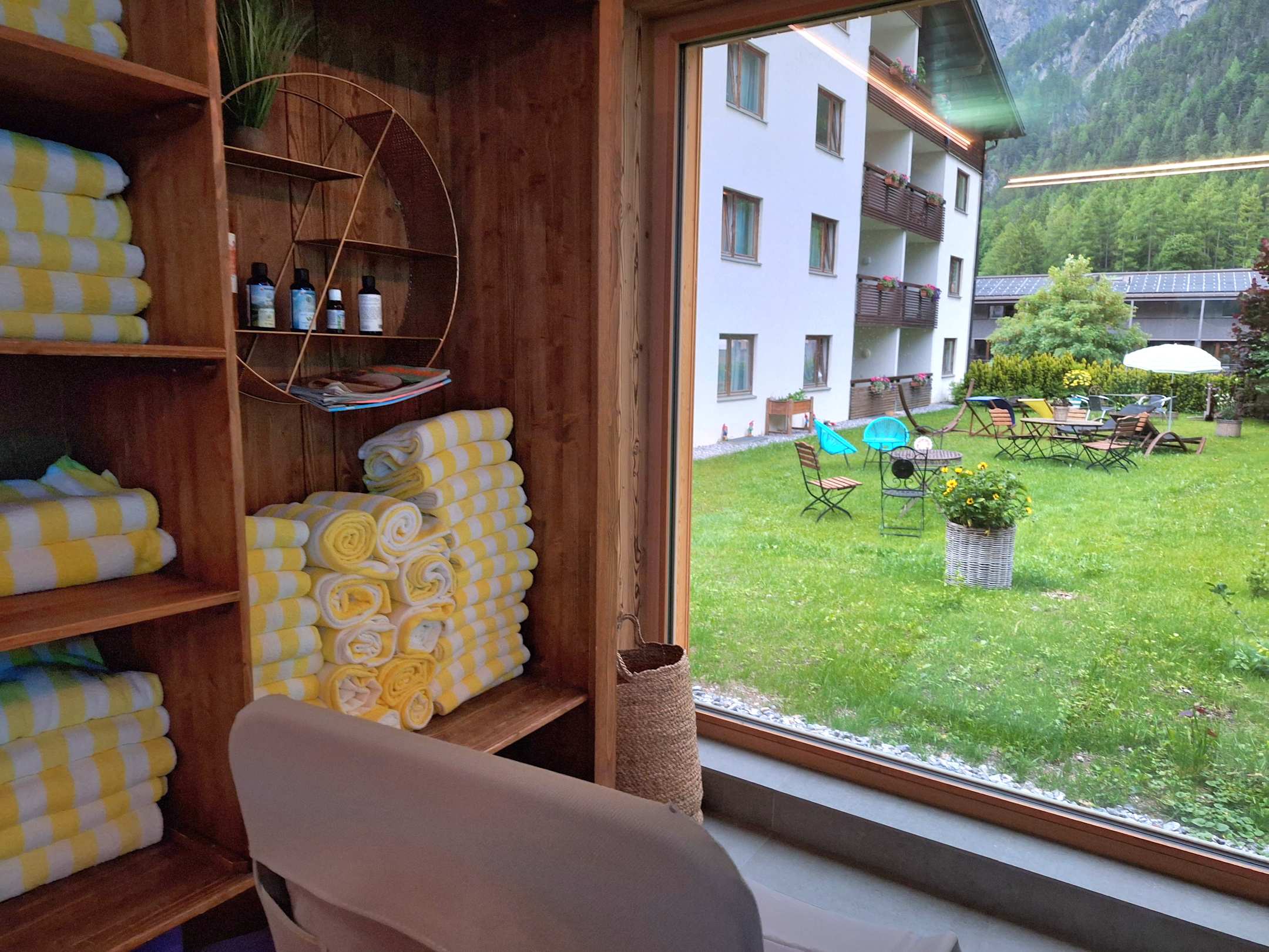 Blick aus der Sauna auf den Garten