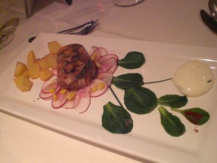 feine Fleischsülze mit Radieschen und Bratkartoffln