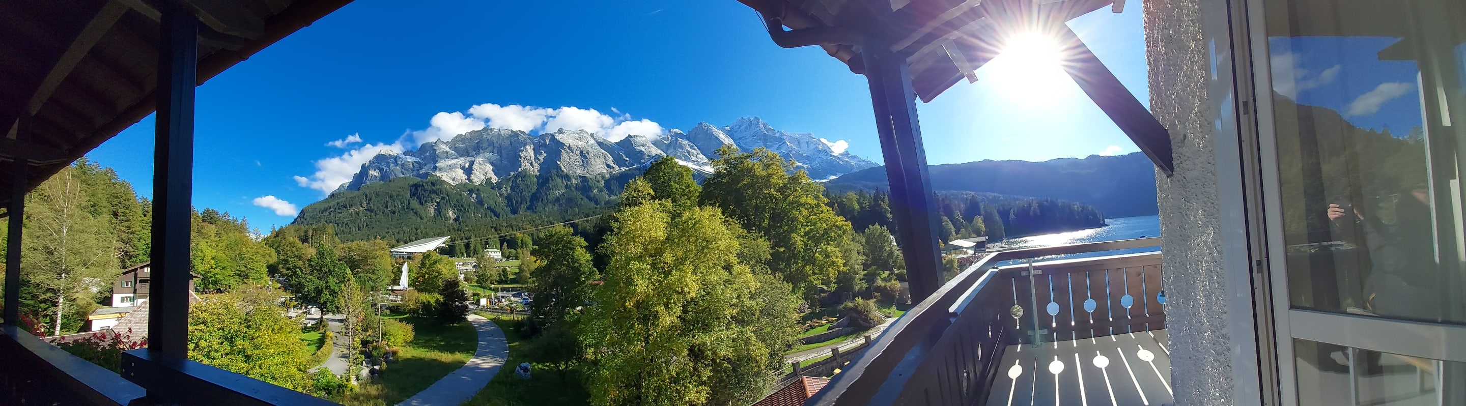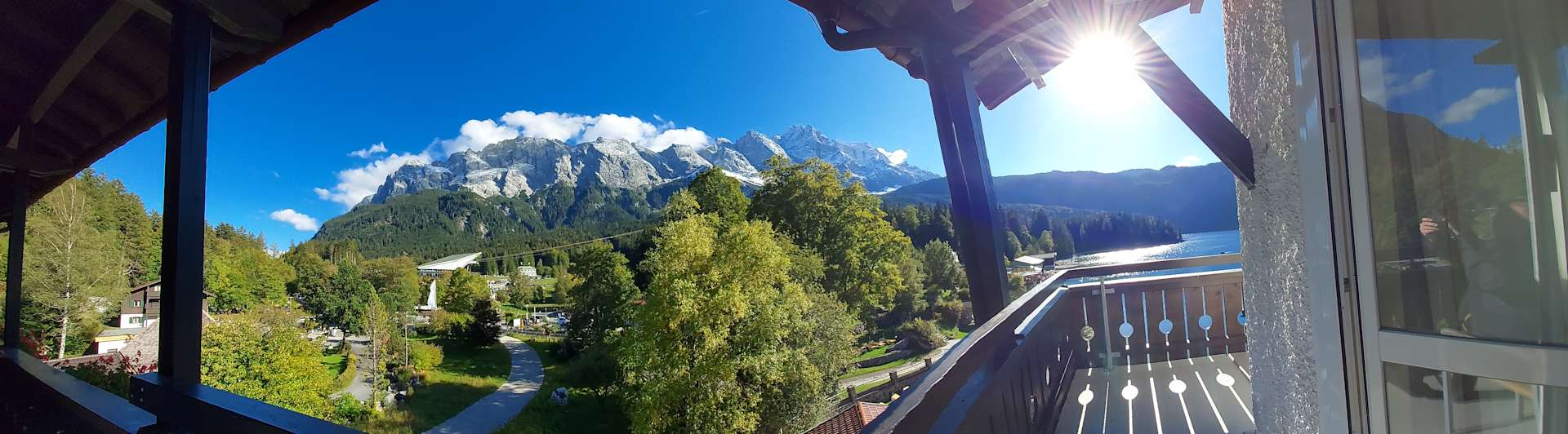 Blick auf die Zugspitzseilbahn mit Zugspitzmassiv und auf den Eibsee vom Panoramasuiteeckbalkon.