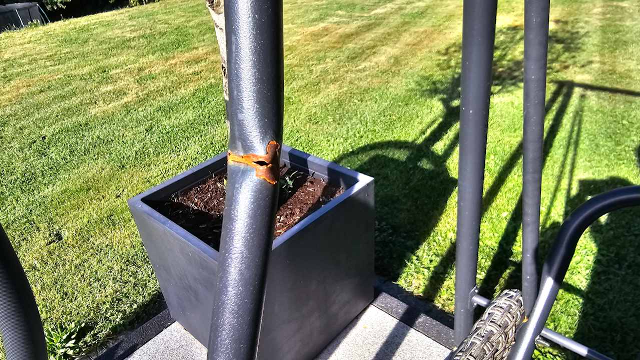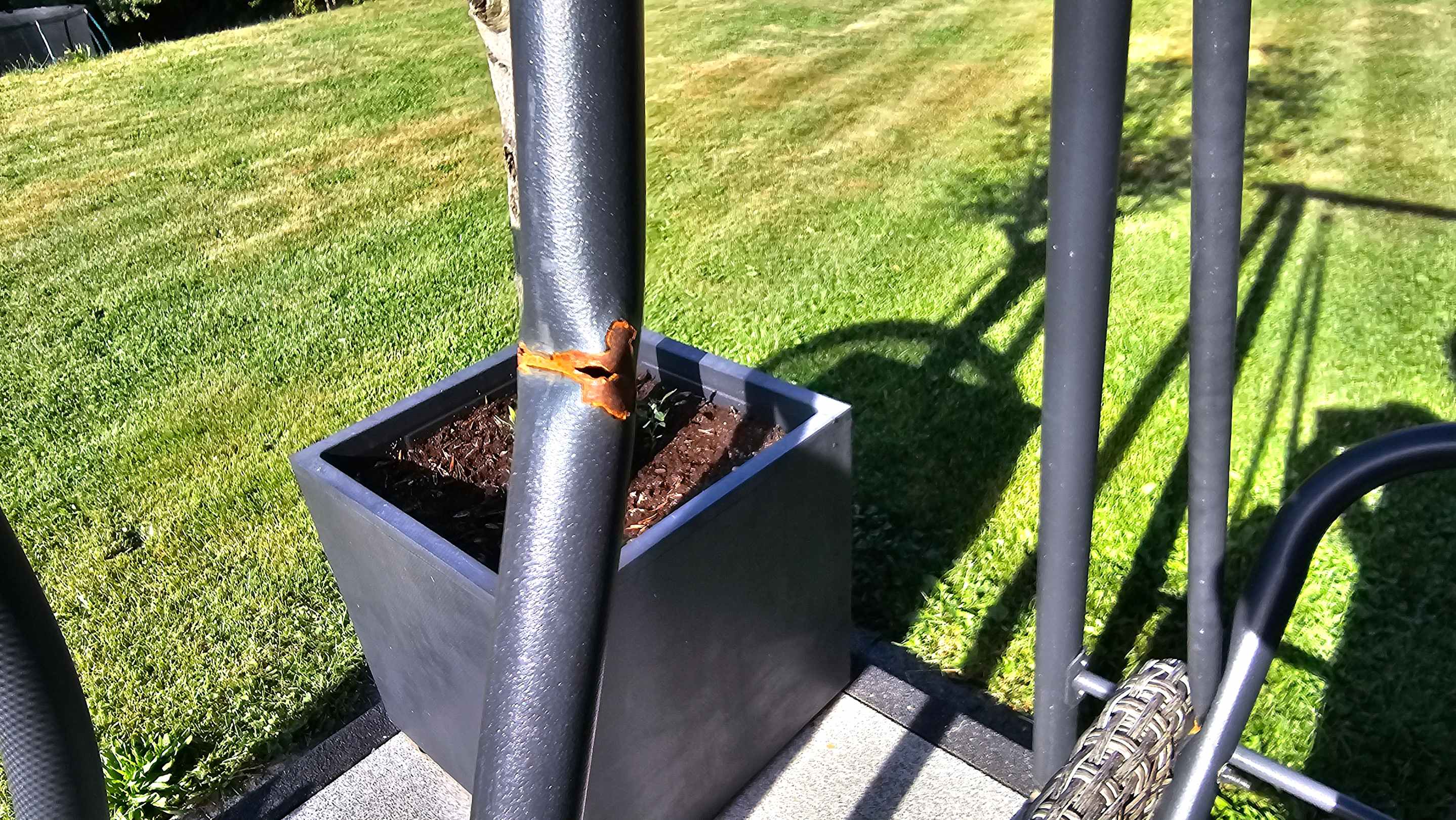 Gestänge der Schaukel mit deutlicher Roststelle und Riss.