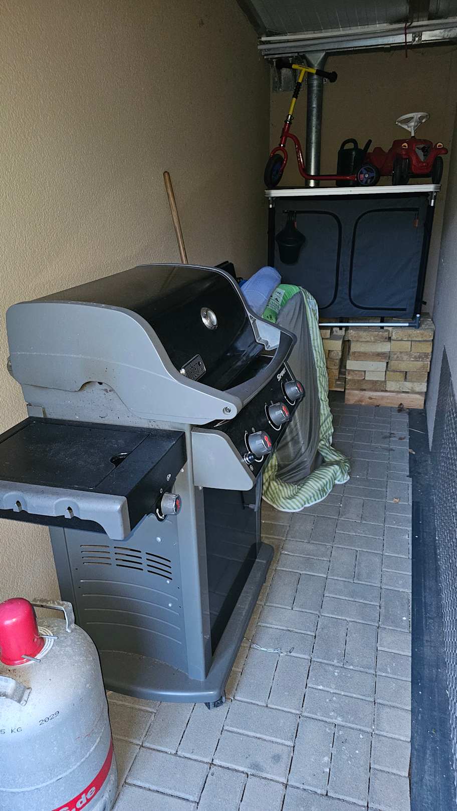 Gasgrill in einer Nische abgestellt; Staubspuren, daneben gelagerte Gegenstände