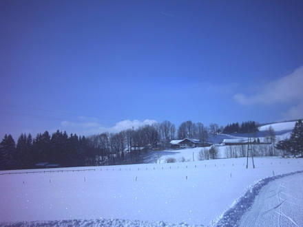 Winterstimmung, Einödhof im Hintergrund und Loipe