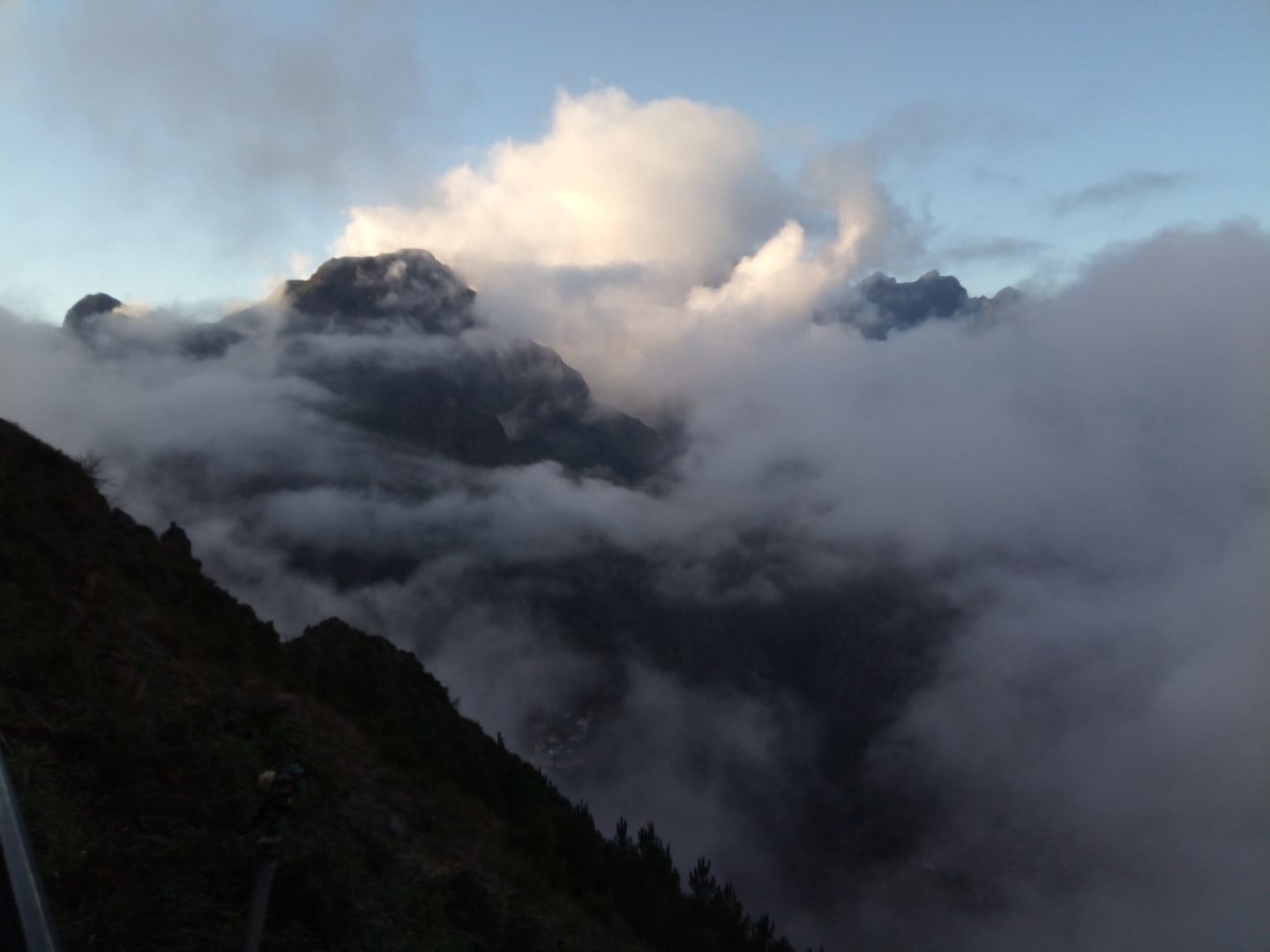 Das Hotel von Wolken umgeben.