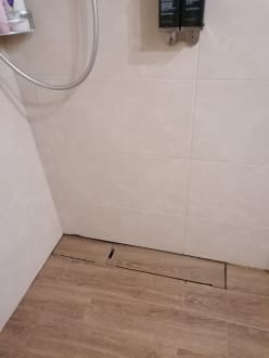 ZimmerImprovisierter Duschablauf! Es gibt auch keine Trennwand der Dusche, somit wird alles nass im Bad!