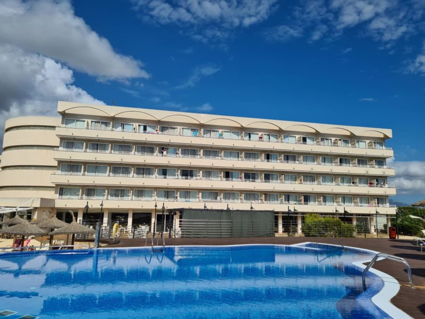 Blick vom Pool auf das Hotelgebäude.