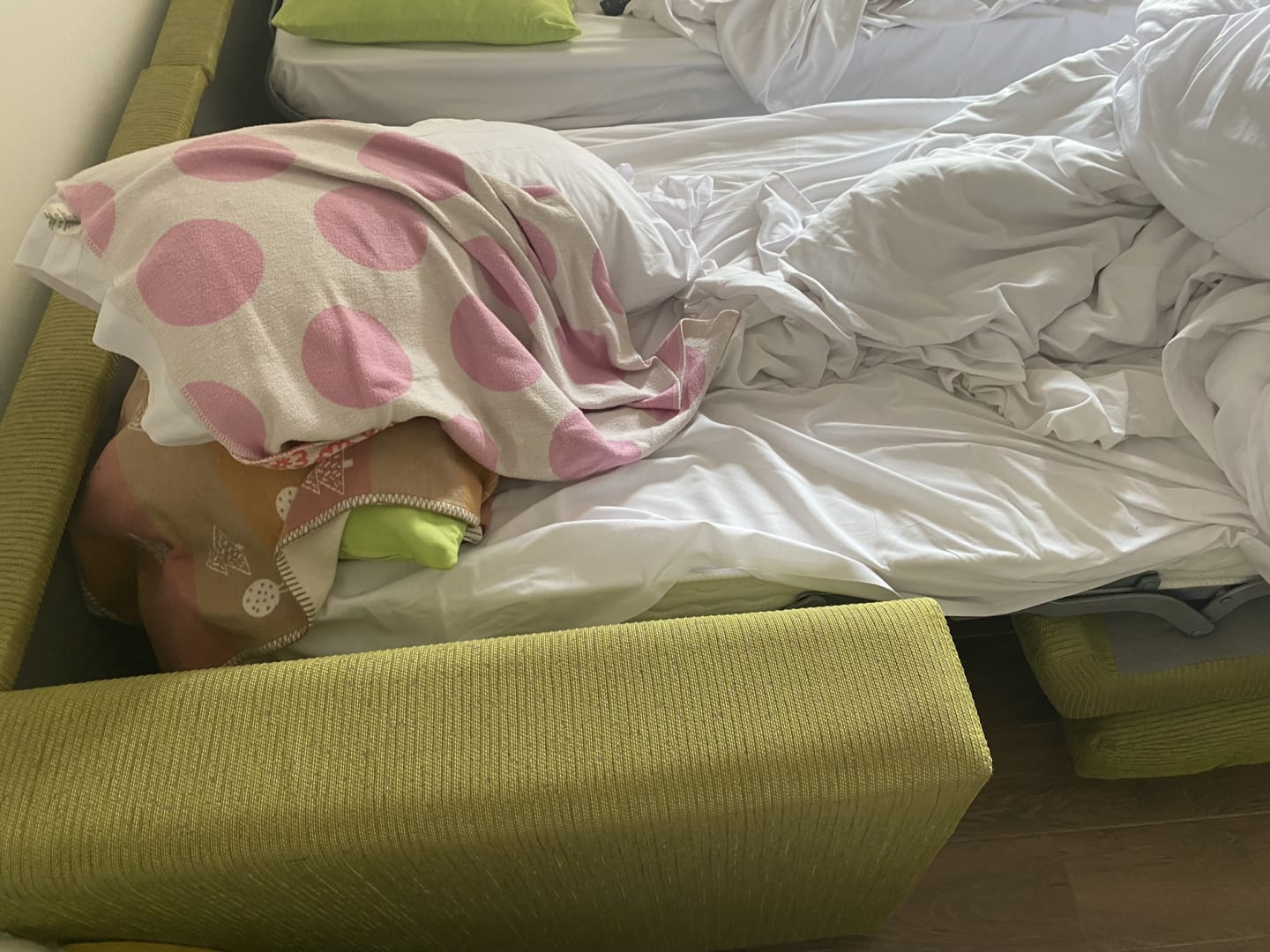 ZimmerAusziehcouch dient als Kinderbetten im familienzimmer. Spricht nichts dagegen, allerdings störten uns die großen Zwischenräume und Metallstreben die neben der Matratze rausschauten sehr! Bequem ist was anderes! Lauter Kühlschranksound die ganze Nacht