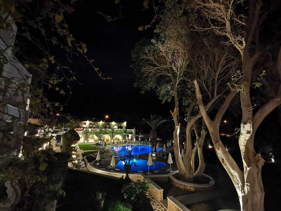 Gartenanlage abends mit beleuchtetem Pool