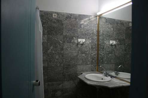 das Bad mit großem Waschtisch, Spiegel, Dusche auf Bodenhöhe mit Vorhang und WC
