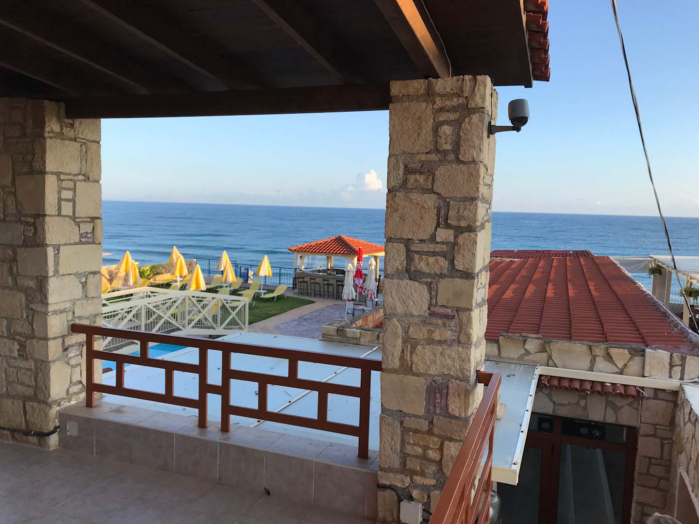 Taverne, Bar und Pool sowie Abgang zum Strand