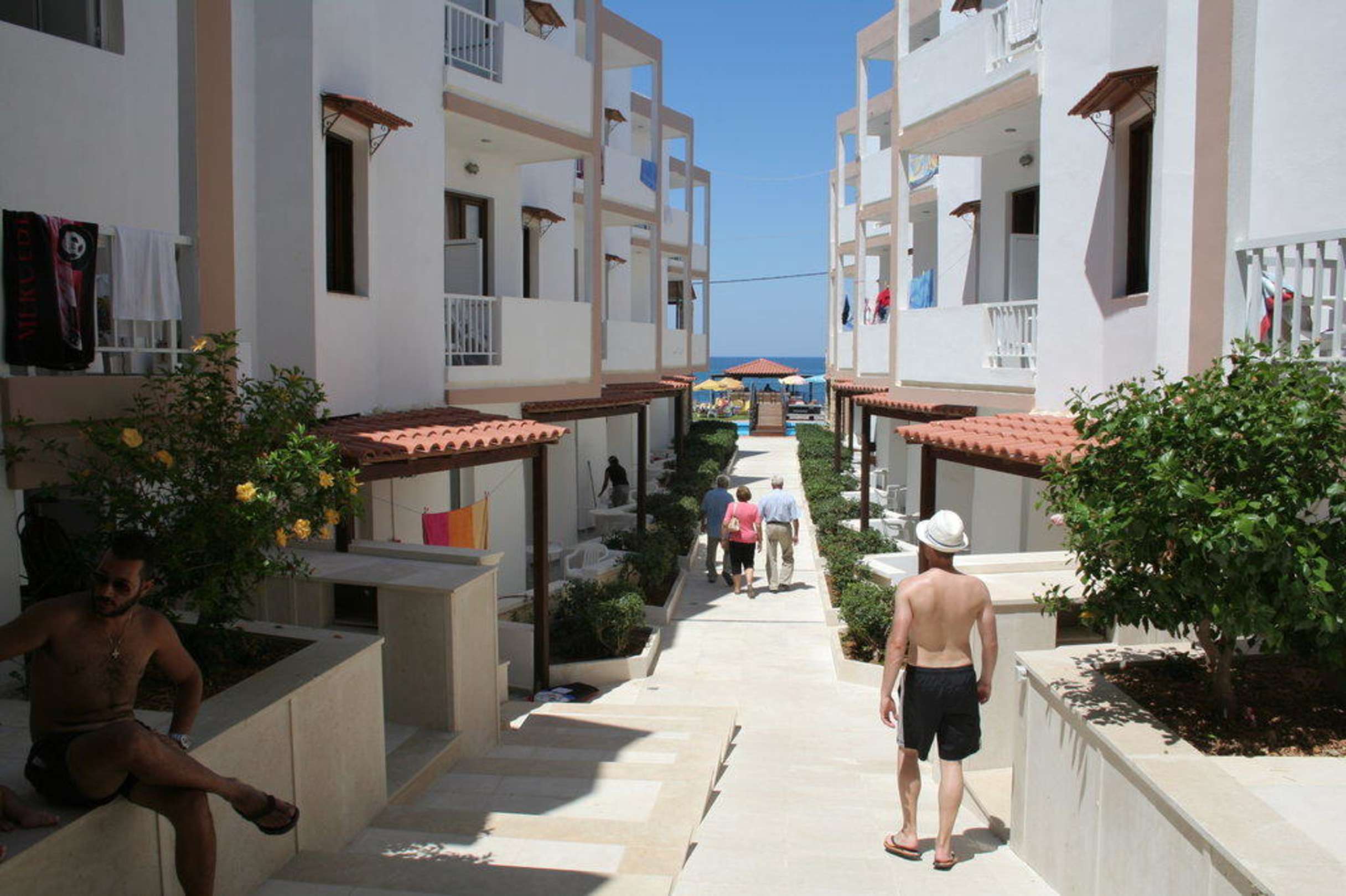 über den Innenhof gelangt man zu den Studios im EG und zum Pool bzw. Meer