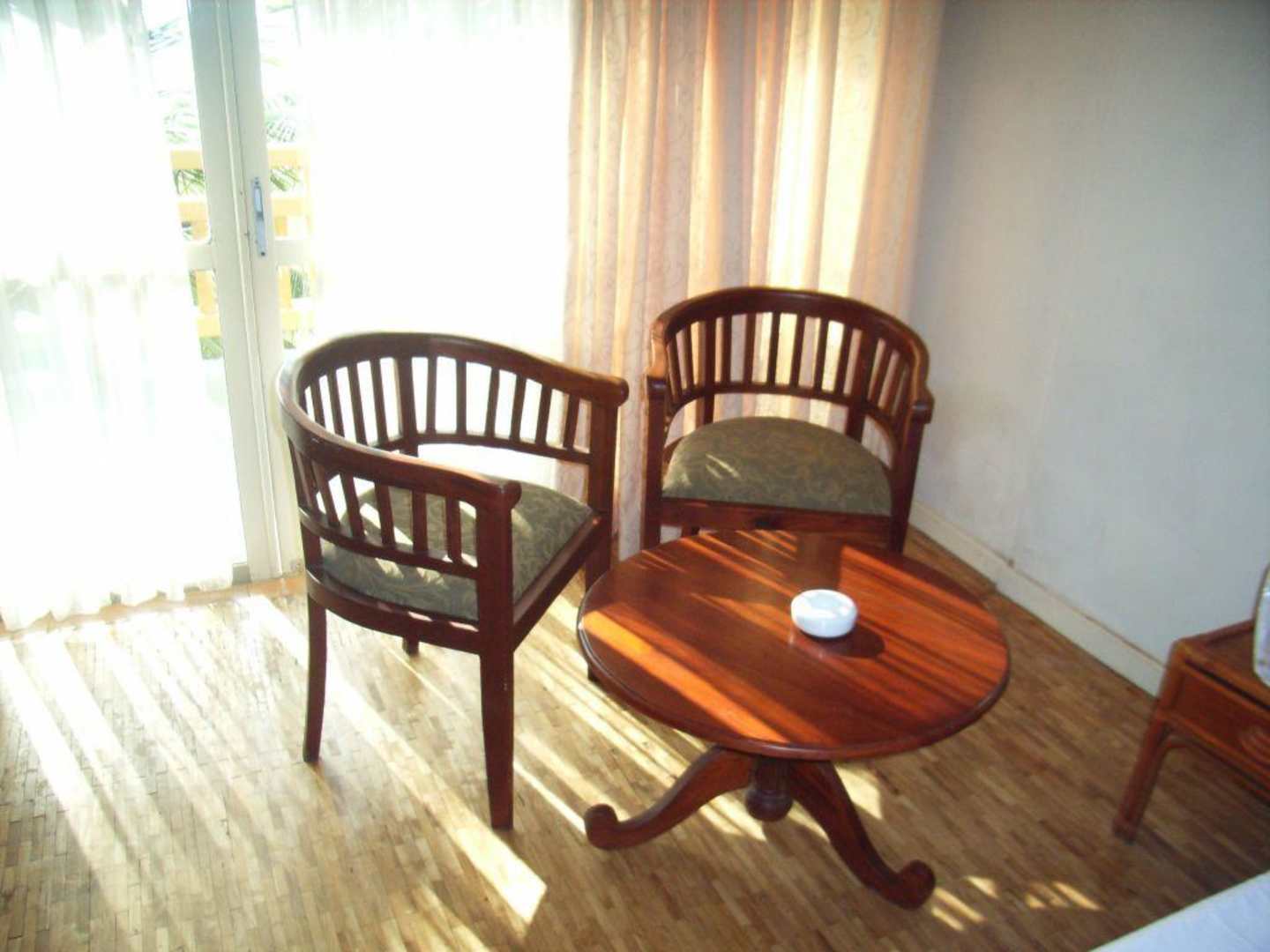 Einfaches Standard Doppelzimmer Zwei Holzstühle + Rundtisch mit Aschenbecher