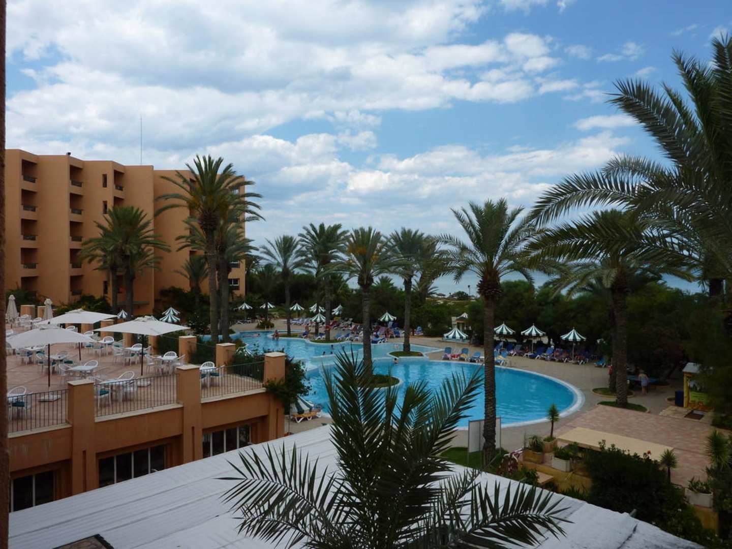 Blick von Zimmer auf den Pool und Bar