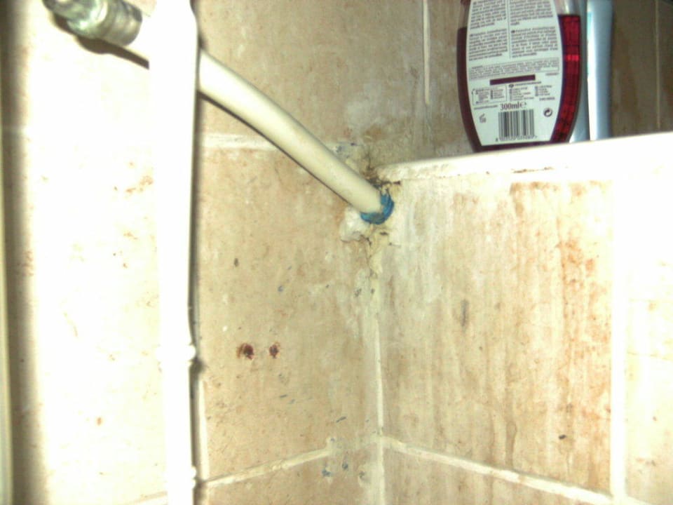 Etwas unschön: Hier haben wir an den ersten Tagen beobachtet, wie kleine Kakerlaken aus einem Loch unterhalb des Wasserrohrs ins Badezimmer gelangt sind.