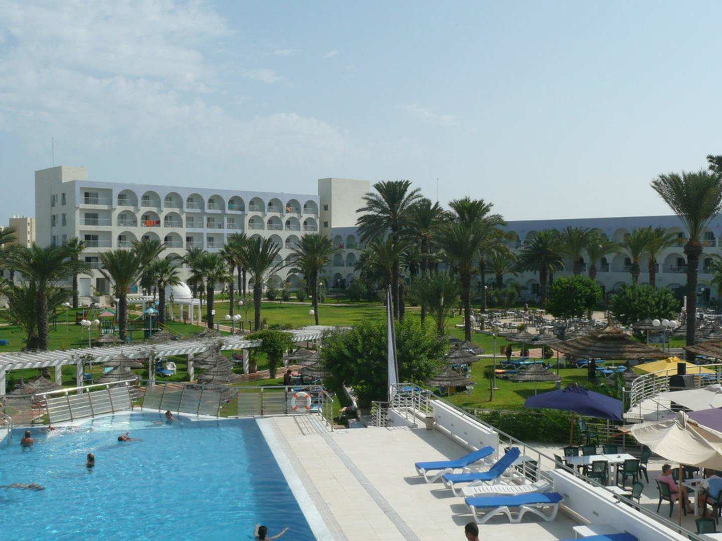 Pool und Hotel und Rasenfläche