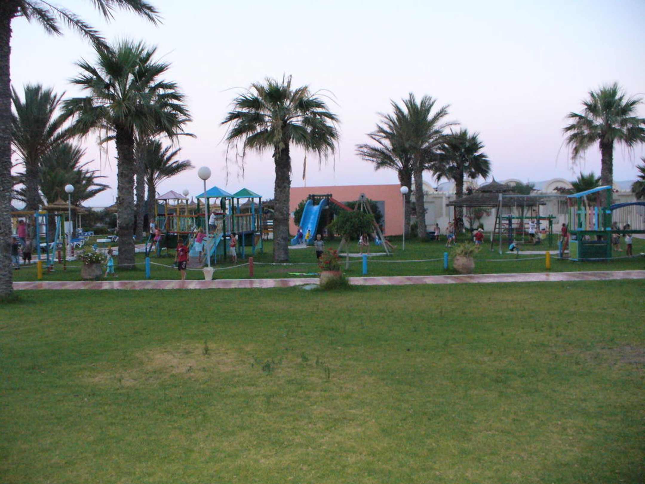 duży plac zabaw dla dzieci za nim znajduje się budynek, w którym odbywają się gry i zabawy dla dzieci, telewizor z bajkami, materace, zabawki, kolorowanki itd. nad którymi czuwa animator