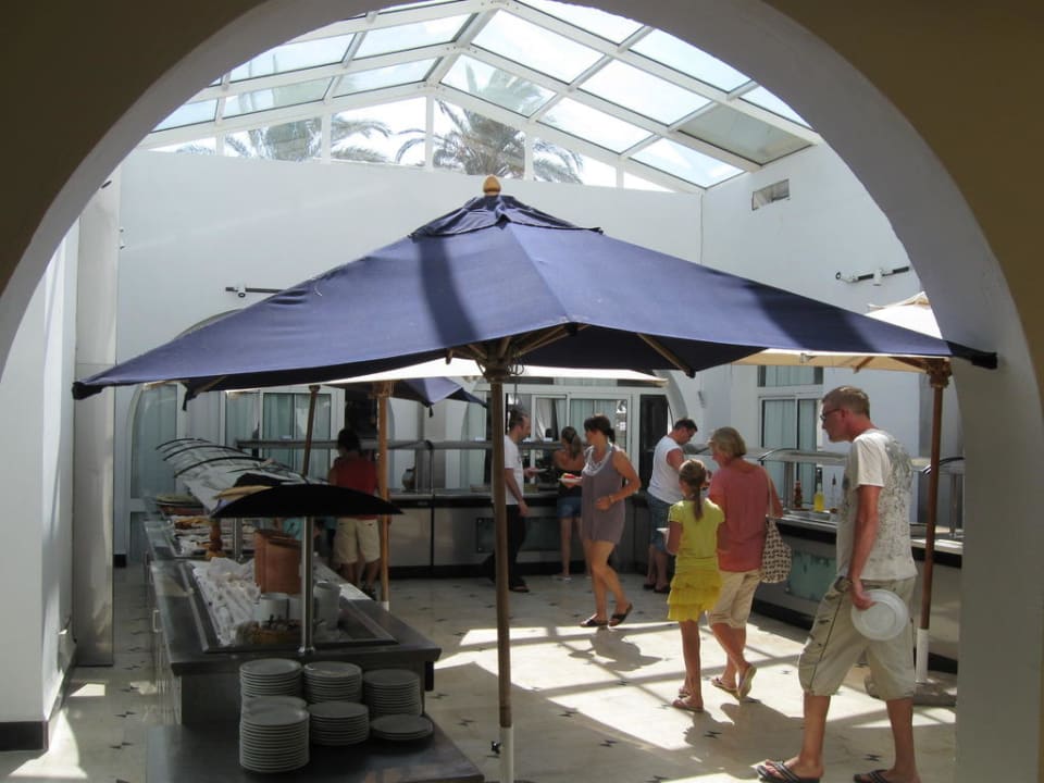 Speiseraum SalatbarWie man sieht, knallt die Sonne normalerweise aufs Essen, wenn da nicht die Schirme wären