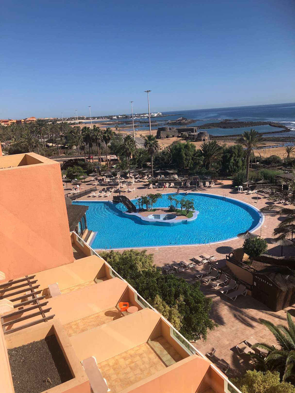 Blick vom Balkon auf die Poollandschaft