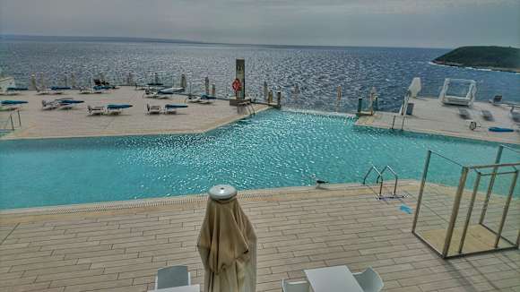 Blick auf den (leider unbeheizten) Pool, der ins Meer zu münden scheint.