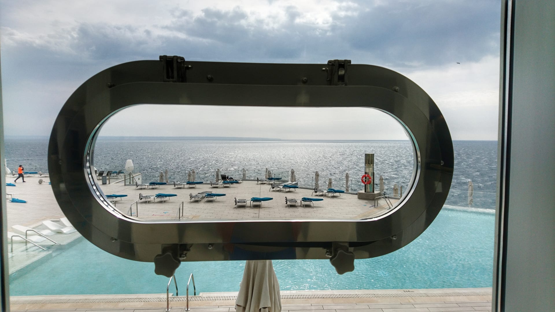 Ausblick von der Lobby auf den Pool und das Meer.