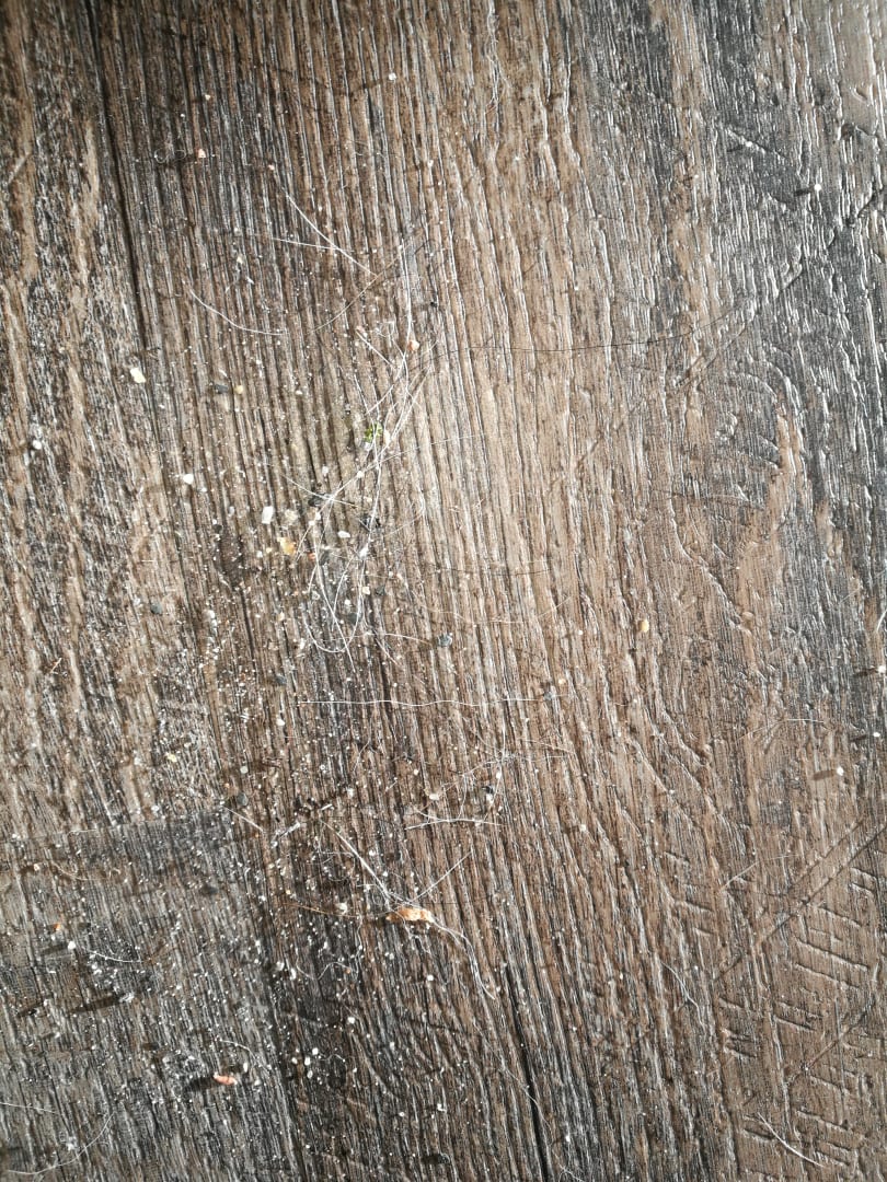 Fußabtreter vor Zimmertür Appartement bei Anreise, Zimmer überall Hundehaare, Terrasse voller Hundehaare, durch Anhaftung der Hundehaare an Polstermöbel fliegen Hundehaare immer wieder herum. Siehe weiter nachfolgende Bilder
