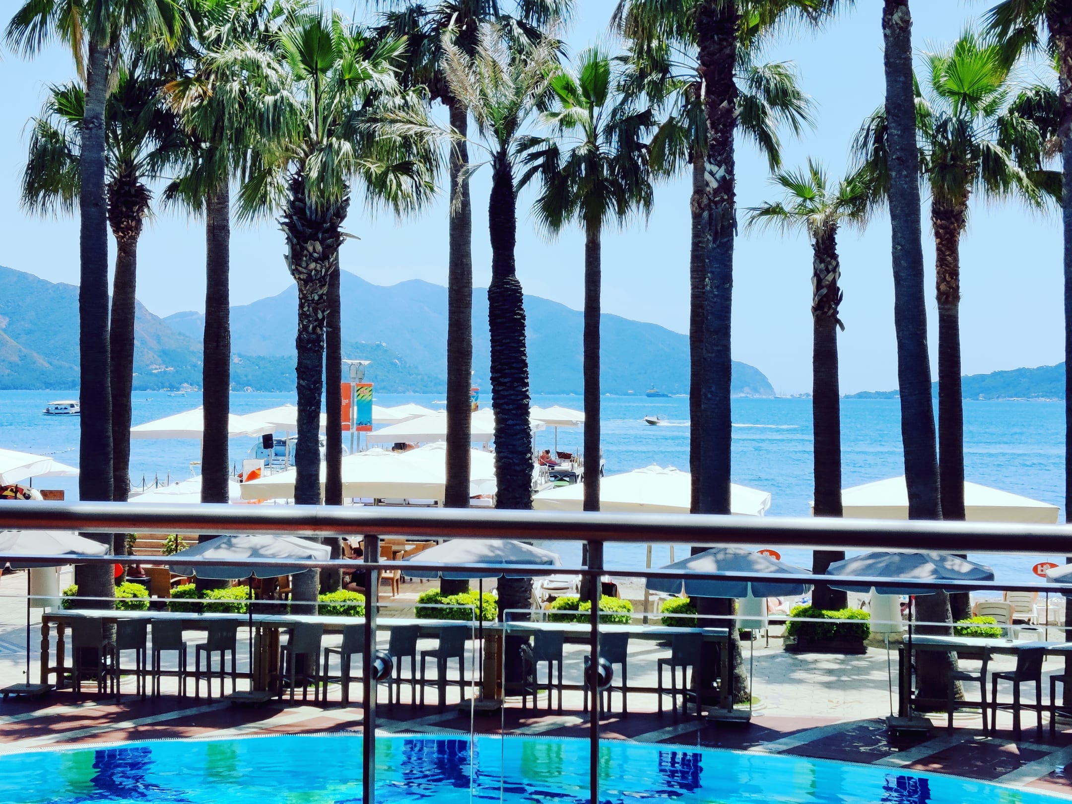 Ausblick vom Balkon auf den Pool und Strand