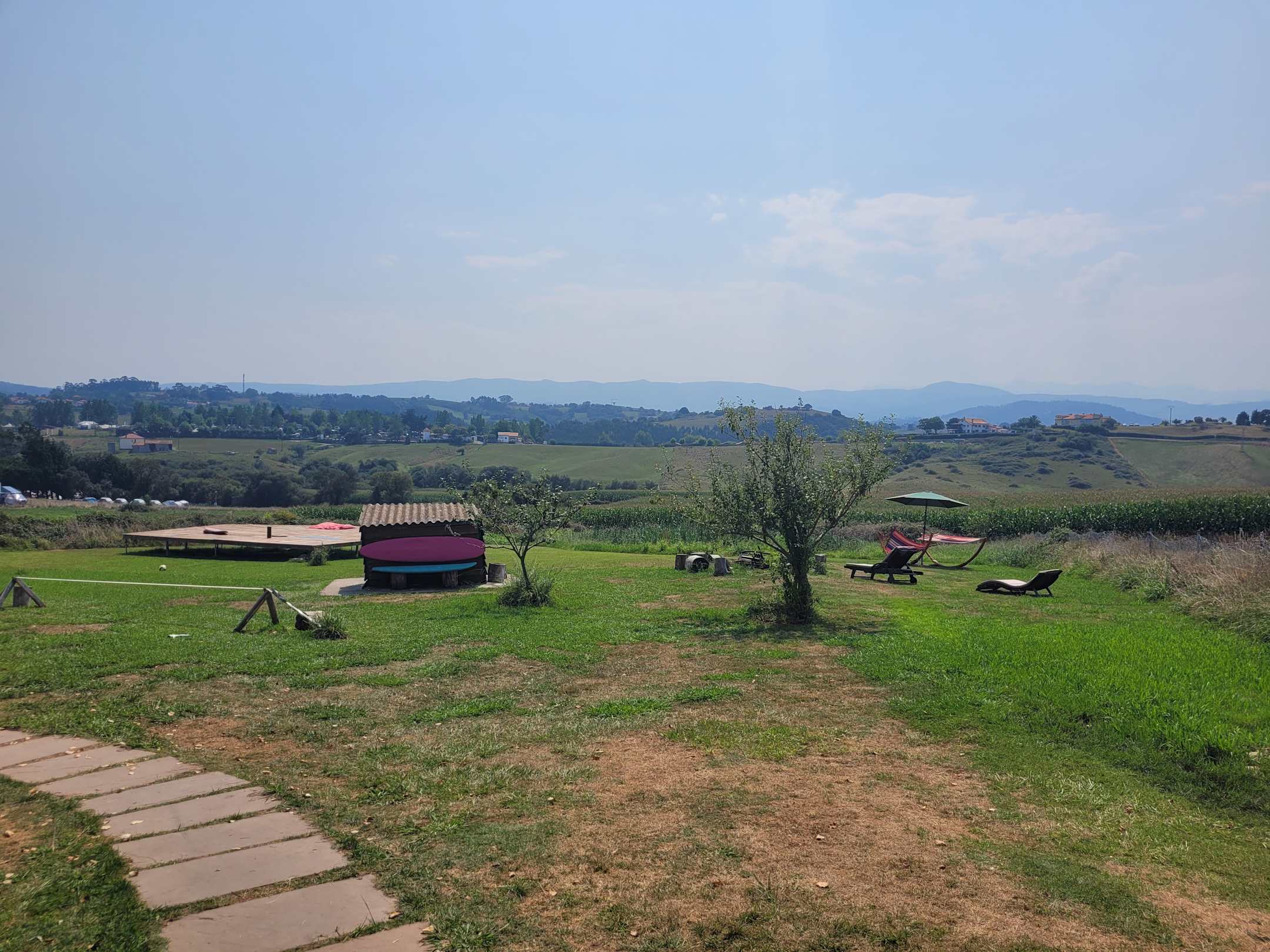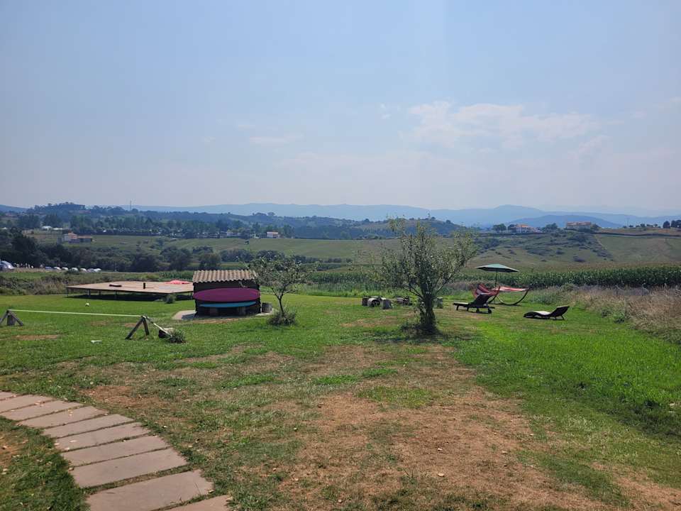 Traumhafter Außenbereich mit Yogaplattform, Hängematten, Volleyballfeld, Slackline, Tischtennisplatte und schöne Aussicht auf das bergige Hinterland.