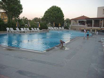 Pool AbendsBlick auf den Pool und ein Teil des halboffenen Restaurants. Die Planen waren unten weil es an dem Tag sehr windig war.
