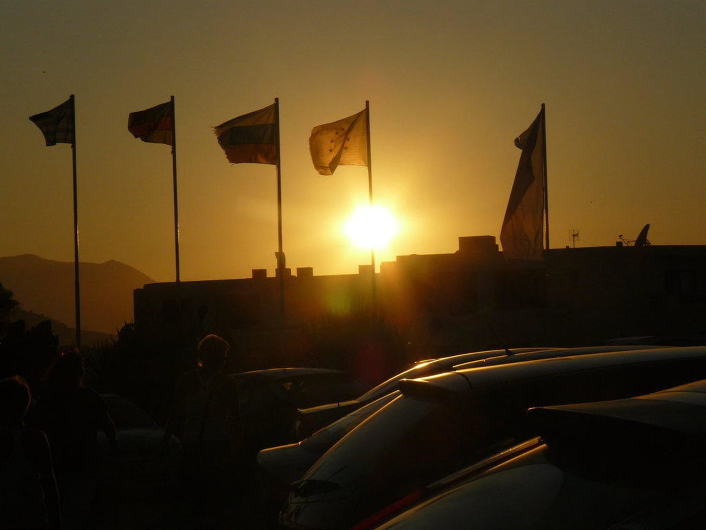 Wehende Fahnen vor dem Hotel mit der untergehenden Sonne.