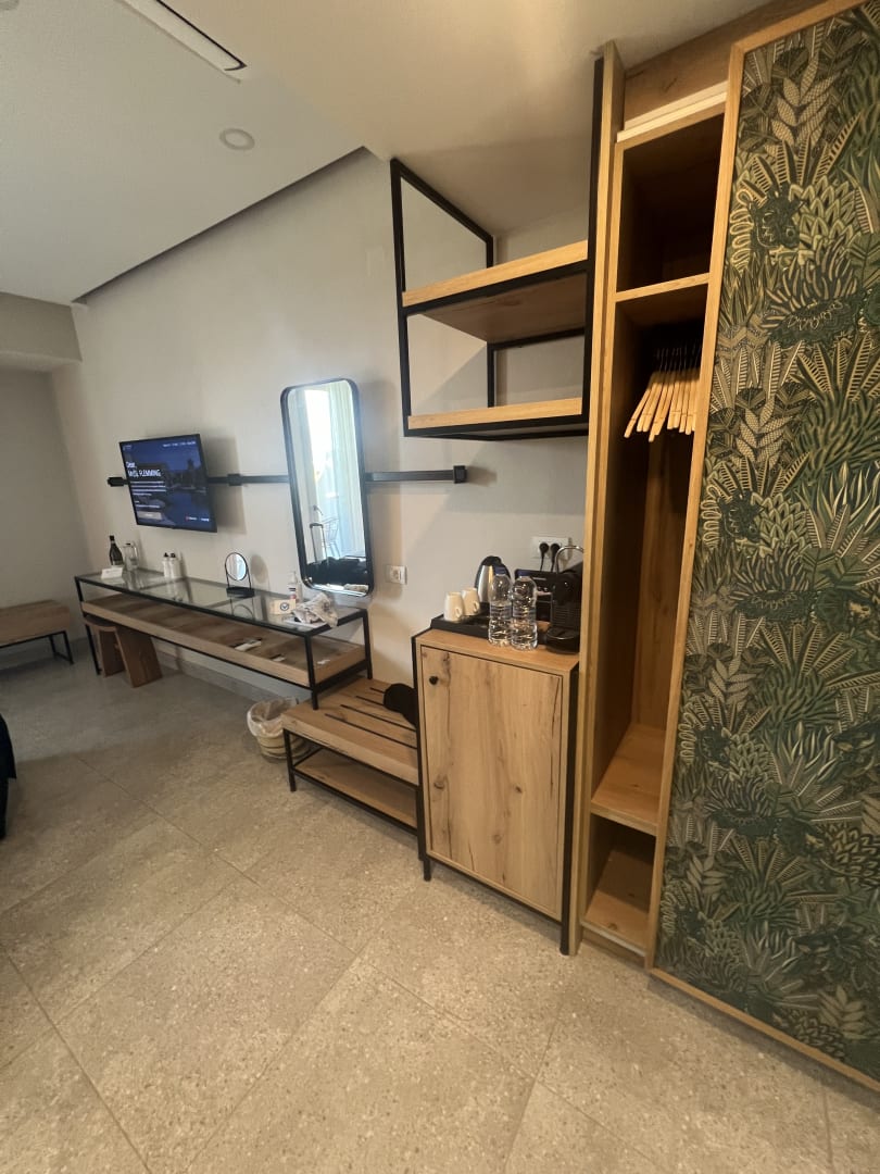 Große Zimmer mit Tresor und Kaffeemaschine und kleiner Balkon mit seitlichem Meerblick
