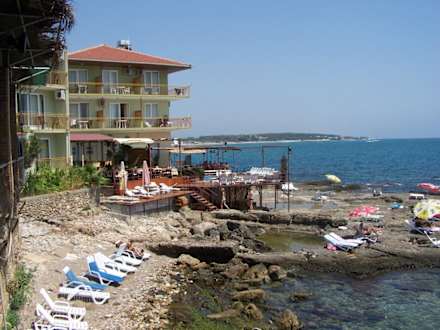 Das Gebäude ist NICHT das Hotel "Elit Köseoglu"! Jedoch dieser tolle Felsenstrand befindet sich DIREKT unter dem "Elit-Restaurant" mit direktem Zugang!