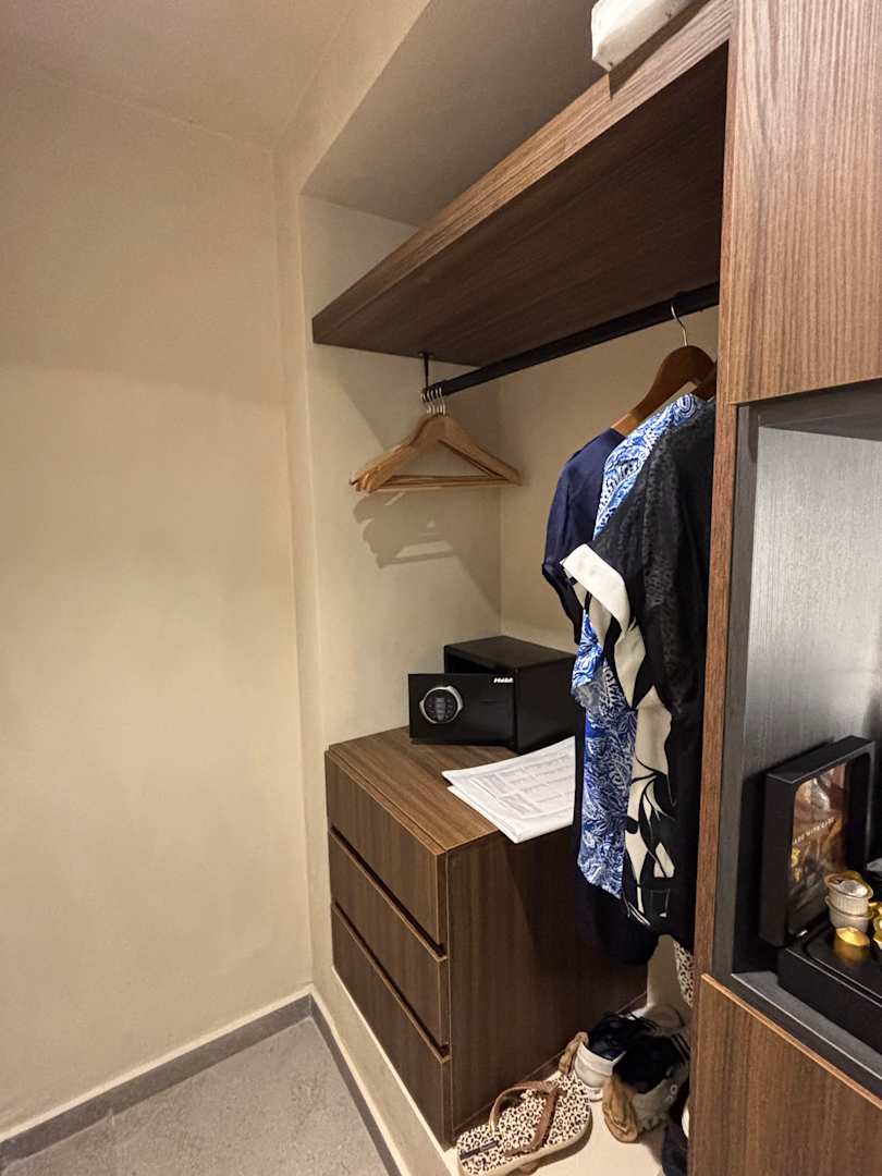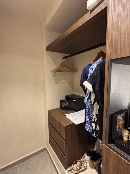 Garderobe, viel zu klein, lange Damenkleider musste ich auf ein Bild im Zimmer hängen. Kein Stadthotel, Gäste haben Kleider für 1-3 Wochen!! Safe billig ohne Bedienungsanleitung.