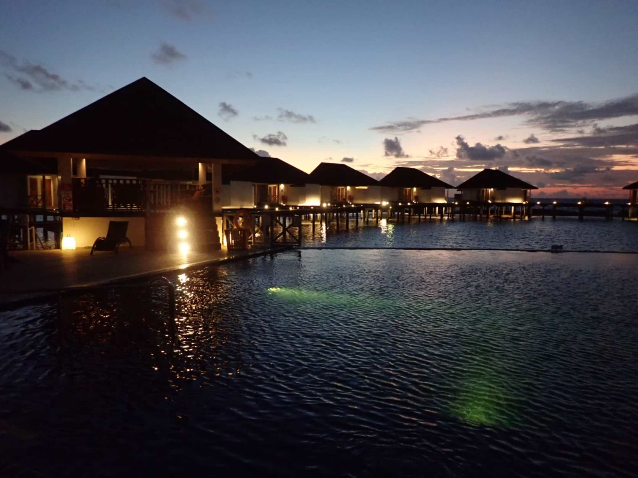 Blick auf die Wasserbungalowanlage vom Pool aus.