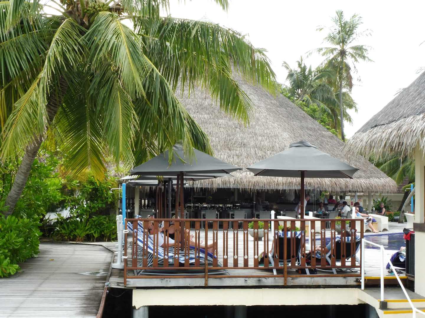 Restaurant und Liegefläche der Wasserbungalows.