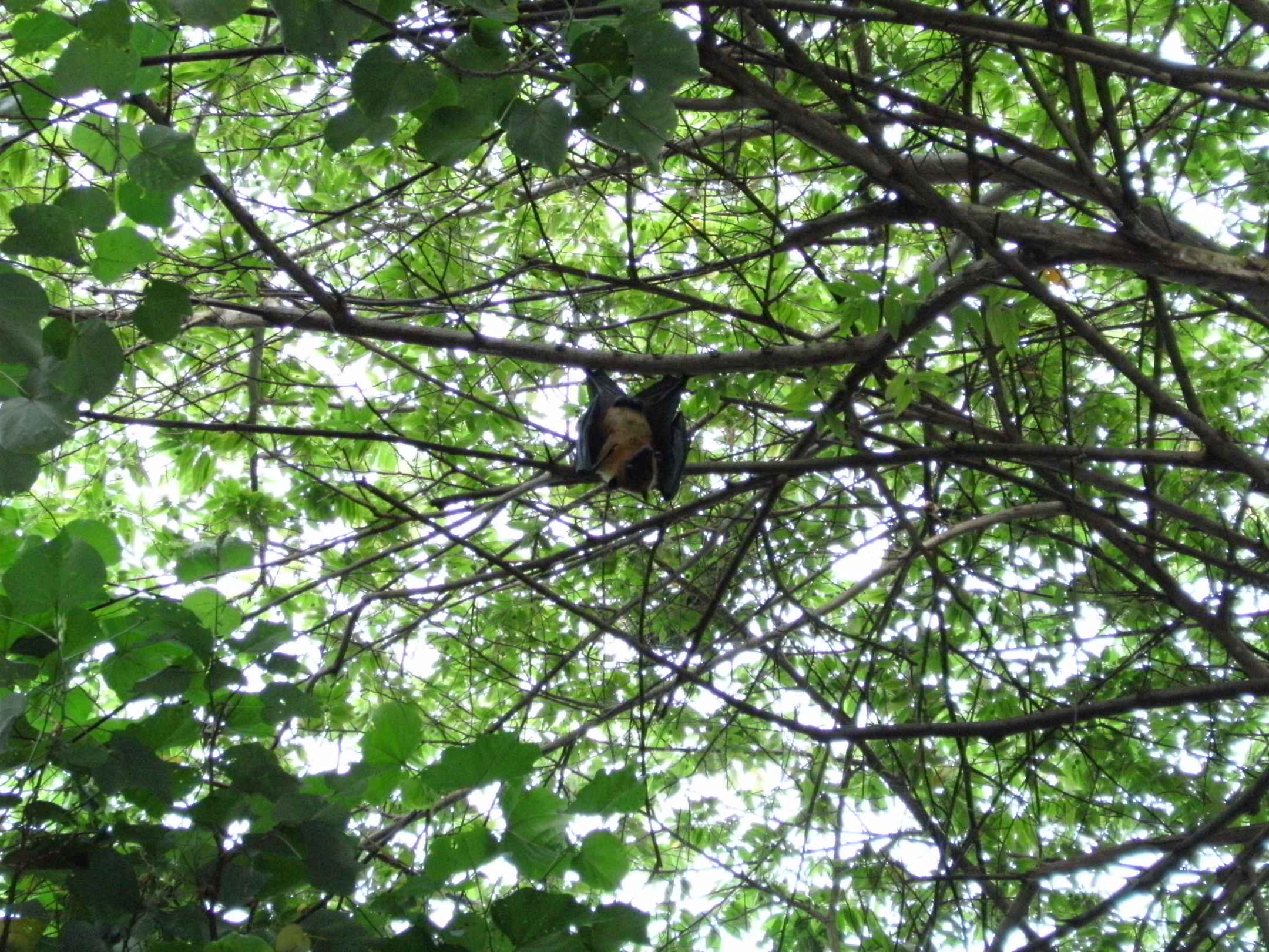 Flughund im Baum über halboffenen Bad